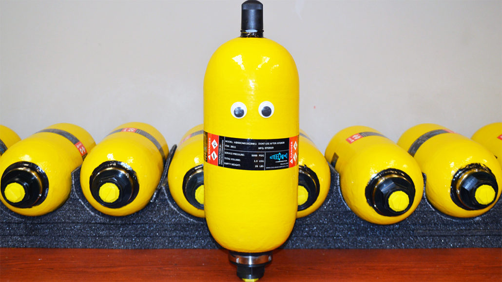 Industrial product or kid toy? Steelhead Composites was requested to finish a set of 5L (1.3 gal), 350 bar (5,000 psi) kevlar and carbon fiber vessels in a specific color — I call the color “minion yellow.” Googly eyes optional.