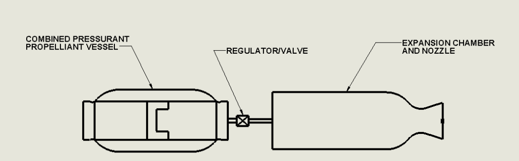 Figure 2. A simplified liquid propellant-based propulsion system design, inclusive of a Steelhead CPPC (left) for propellant storage and expulsion.
