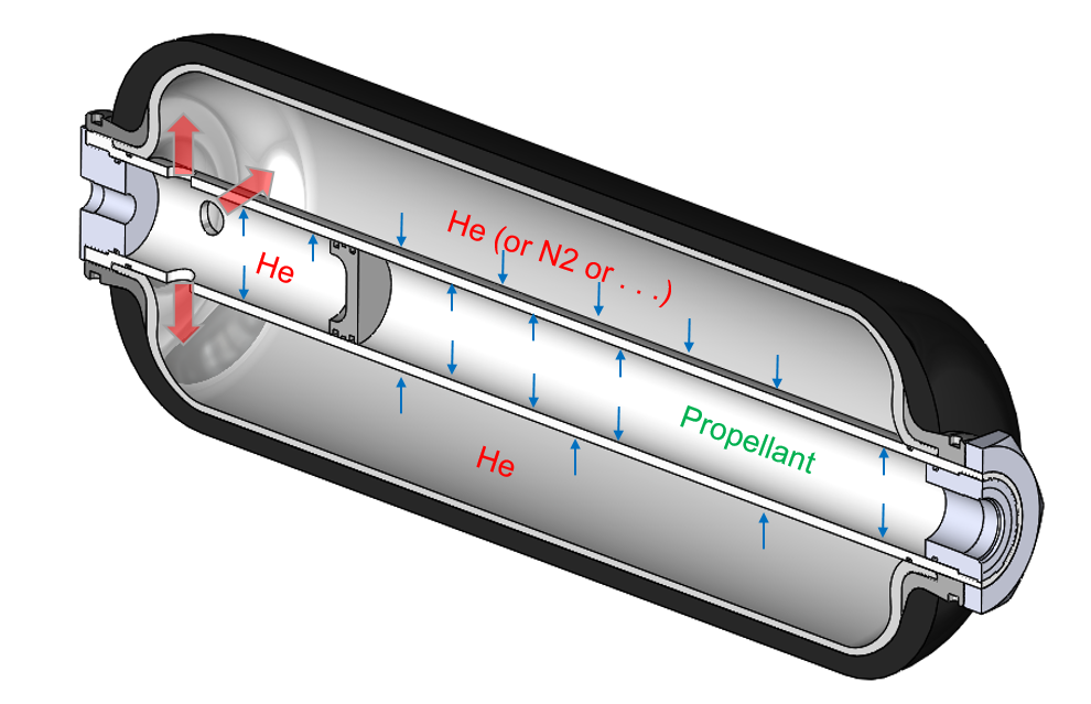 The working gas (helium, nitrogen) would be pressurized in the external chamber will be in isostatic pressure with the propellant. The pressurant gas would be isolated from any propellant and the composite vessel would hold all of the pressure providing structural integrity during operation, thus a very intriguing rocket propellant tank.