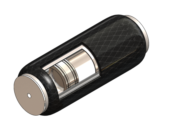 A communication pathway exists between the compartment containing compressible gas and the annular area between the piston chamber and the structural shell. This can be accomplished by allowing holes or slits in the piston chamber on the gas compartment side. The pressure in the compressed gas is structurally supported by the structural shell, a plastic/metal/no liner with composite reinforcement.