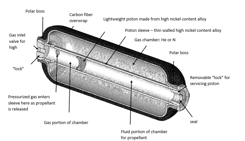 With this novel design, the internal diameter of the piston chamber can vary, allowing a differing ratio of pressurant to propellant, including to allowance of a very large (70-85%) piston sleeve compared to the internal diameter of the pressure vessel and thus a high volume of propellant.