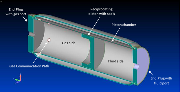 The piston chamber contains a compressible gas on one side, such as helium or nitrogen which is kept separate from the propellent by the reciprocating piston. The radial seals separates the pressurant and the propellant in the two compartments. After insertion inside the pressure vessel, the cylindrical piston chamber is sealed against the polar opening using radial seals. This prevents leakage of gas or fluid past the port opening of the pressure vessel. The annular area between the cylindrical piston chamber and the structural shell that is filled with the pressurant gas.