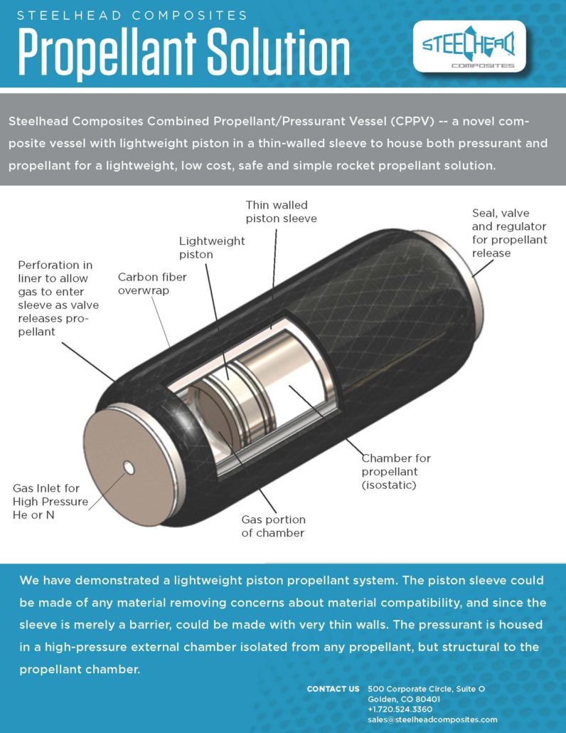 As there is increased attention in space launch, satellite launch etc., a new propellant tank designed is desirable with enhanced safety, increased simplicity and a much-reduced cost. Steelhead Composites offers this solution in a piston vessel which we call the Combined Pressurant/Propellant Vessel (CPPV).